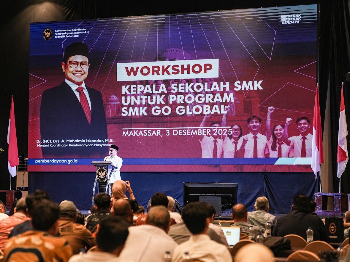 MAKASSAR-Menteri Koordinator Pemberdayaan Masyarakat, Abdul Muhaimin Iskandar atau Cak Imin menegaskan perlunya percepatan transformasi pendidikan vokasi agar lulusan SMK mampu terserap pasar kerja global. Hal itu ia sampaikan saat menghadiri Workshop Kepala Sekolah se-Sulawesi Selatan untuk Program SMK Go Global di Makassar, Rabu (3/12/2025).